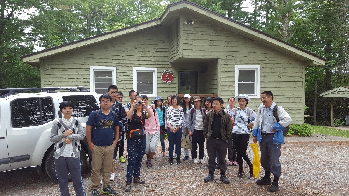 2016年浙大生态系副主任邱英雄教授带队在北卡阿巴拉契亚山区野外实习营地,图为实习出发前。