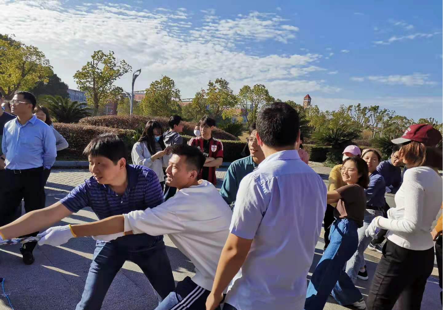本次体育节共九支队伍参赛,项目包括拔河、同心击鼓、八人九足、跳绳与飞镖。拔河比赛竞争极为激烈。哨声吹起开战的信号,两边队员怒吼着齐整的口号,你来我往不断对抗。导师也纷纷上阵,加入到在队伍最前方,终于,在数轮激烈对抗后,陈海峰团队卫冕冠军。