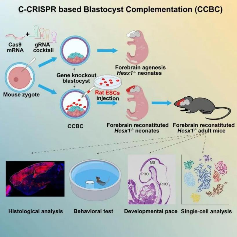 2024年4月25日,美国得克萨斯州西南医学中心吴军团队、中科院脑科学与智能技术卓越创新中心(中科院神经所)杨辉/周海波团队和中科院动物所郭帆团队合作在Cell杂志发表题为Generation of rat forebrain tissues in mice的文章。该研究展示了一种优化的囊胚互补技术,利用该技术研究者筛选出了支持前脑囊胚互补的基因Hesx1,并成功在小鼠体内生成了功能性大鼠前脑组织。异种前脑互补为研究大脑发育以及认知功能机制在进化上的保守和差异性打开了大门。优化的囊胚互补策略具有极大的潜力,可以拓宽异种器官生成的研究和应用。