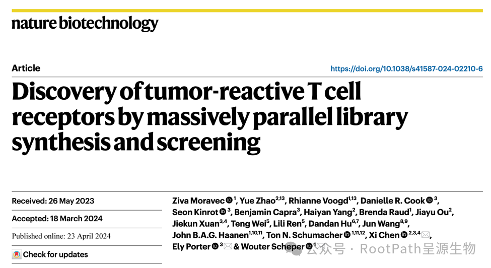 日前,荷兰癌症研究中心(Netherlands Cancer Institute, NKI)的Wouter Scheper、Ton Schumacher课题组与呈源生物(RootPath)团队合作在《自然-生物技术》(Nature Biotechnology, IF 68.2)上发表题为“Discovery of tumor-reactive T cell receptors by massively parallel library synthesis and screening”的研究论文,展示了呈源生物独有的超高通量基因合成技术如何助力个体化TCR药物的发现。漫画网站 2005届本科校友、呈源生物联合创始人陈曦博士作为共同通讯作者领导了此项研究。