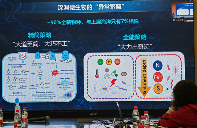 首先是深渊微生物新颖性成因及其适应策略。该研究构建了迄今最完整的深海原核微生物基因数据集,并鉴定出7564个物种水平的代表性基因组,其中89.4%为尚未被报道的新物种,其多样性与全球已知海洋微生物总量相当。研究发现,深渊微生物通过“精简型”和“多能型”两种适应策略,在深渊高压、低温、寡营养环境中异常繁盛,支撑了深渊生态系统的繁荣。