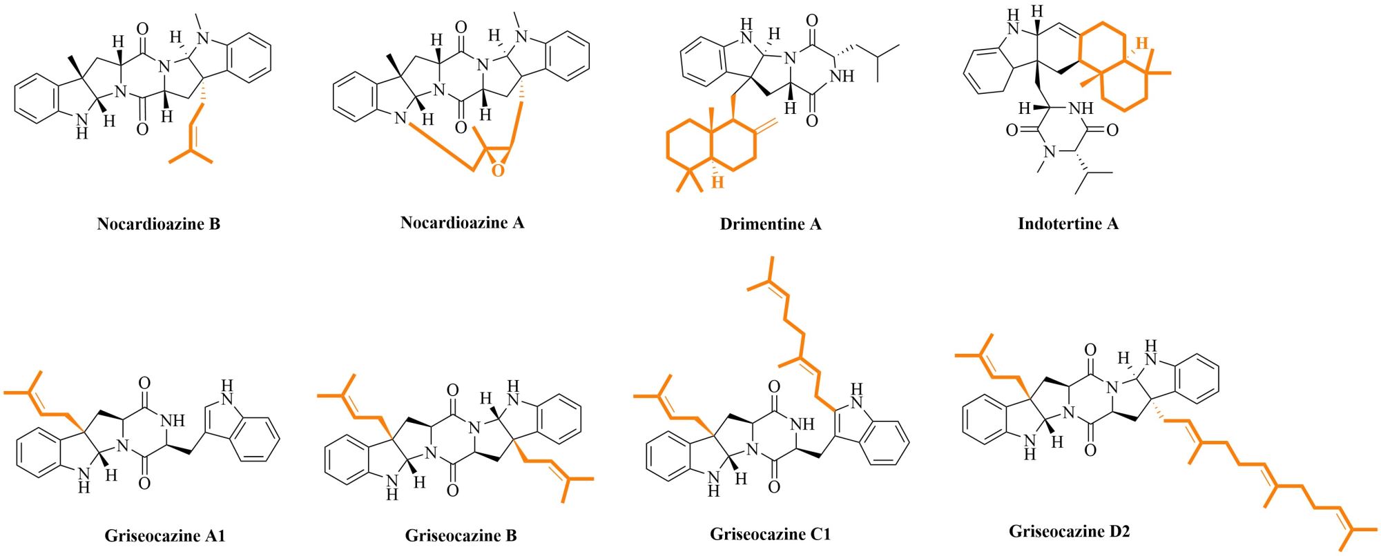 细菌来源的天然产物种类繁多,通过在核心骨架上引入异戊烯基化修饰,极大地扩展了它们的结构多样性和生物学活性,为小分子新药开发提供了重要的化合物资源。目前报道的大多数天然产物类型,如非核糖体肽、核糖肽、二酮哌嗪衍生物(图3)、聚酮类、氨基香豆素、多环喹啉衍生物、吲哚衍生物、吩嗪类衍生物、酚类衍生物以及磷脂类化合物等,均可见特定位置的C或N位点连接长短不一、线性或环化的异戊烯基单元,从而赋予化合物独特的结构骨架。
