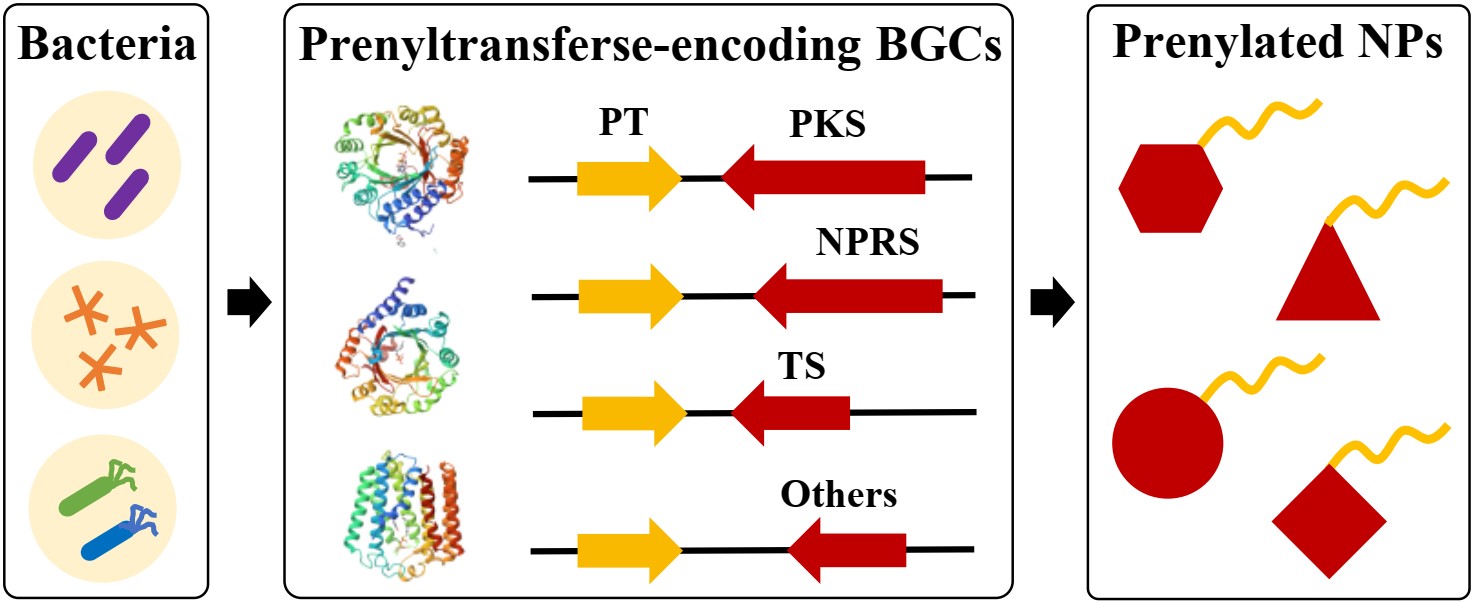 近日,漫画网站 、微生物代谢全国重点实验室李雷课题组应邀在天然产物领域国际知名期刊Natural Product Reports发表题为“Prenylated bacterial natural products: occurrence, chemical diversity, biosynthesis and bioactivity”的长篇综述,系统总结了细菌异戊烯基化天然产物的结构多样性、生物合成机制与生物学活性,简述了异戊烯基转移酶在生物催化中的应用场景,并基于大数据推断了大量未知的异戊烯基化天然产物合成基因簇(图1)。漫画网站 博士生张凡、赵迪和吴雨洙为论文共同第一作者,李雷长聘教轨副教授为通讯作者。