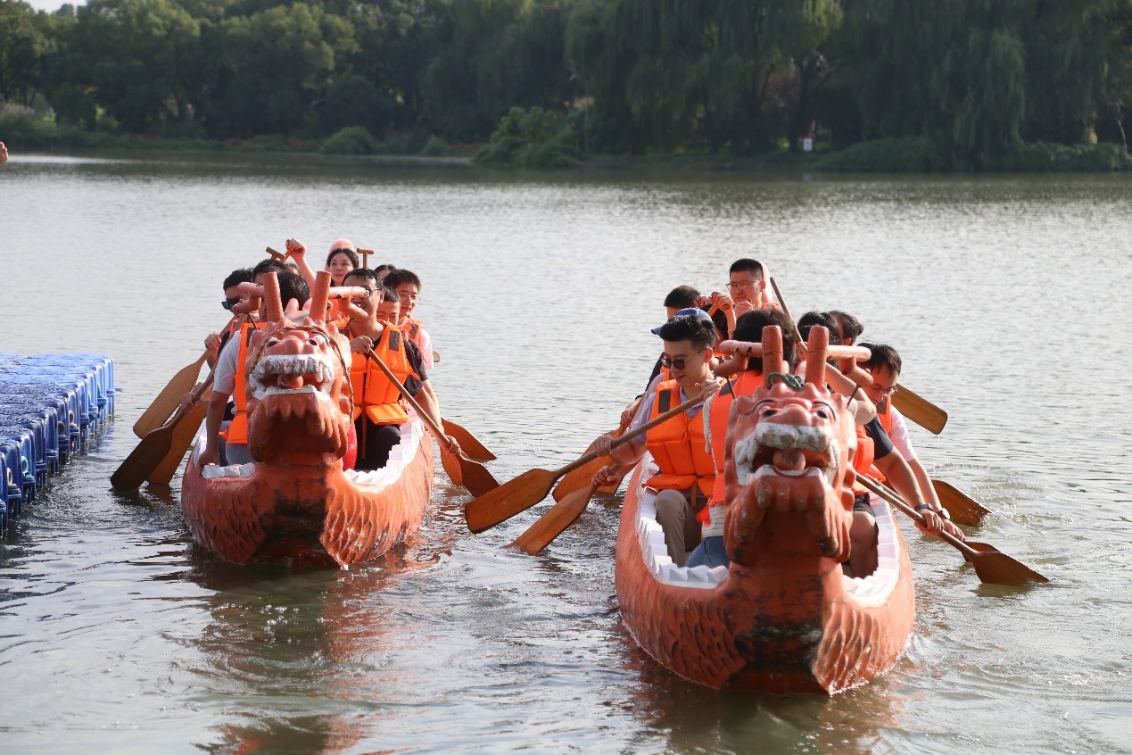 在结束陈云纪念馆学习参观活动之后,全体党员来到东方绿舟拓展基地开展素质拓展活动,活动分为龙舟竞渡、一鼓作气、水到渠成等拓展环节。龙舟竞渡,在铿锵的鼓点声中,各队成员心往一处想、劲往一处使,挥桨击水,奋楫争先,深刻体悟了“同舟共济”的团队内涵与步调一致的执行力量。“一鼓作气”项目要求团队成员紧密配合,牵引鼓面颠球,大家从生疏到默契,在一次次失败与调整中,将专注力与协作力凝聚于每一次起落。而在“水到渠成”环节,各队需利用半截管道,合力搭建一条输送通道。大家群策群力,精准衔接,在实践中深化了流程优化与高效协作的重要性。活动现场气氛热烈,欢声笑语不断,从策略商讨到默契配合,从相互鼓励到共同庆祝,每一位成员都在挑战中超越了自我,在协作中增进了情谊。