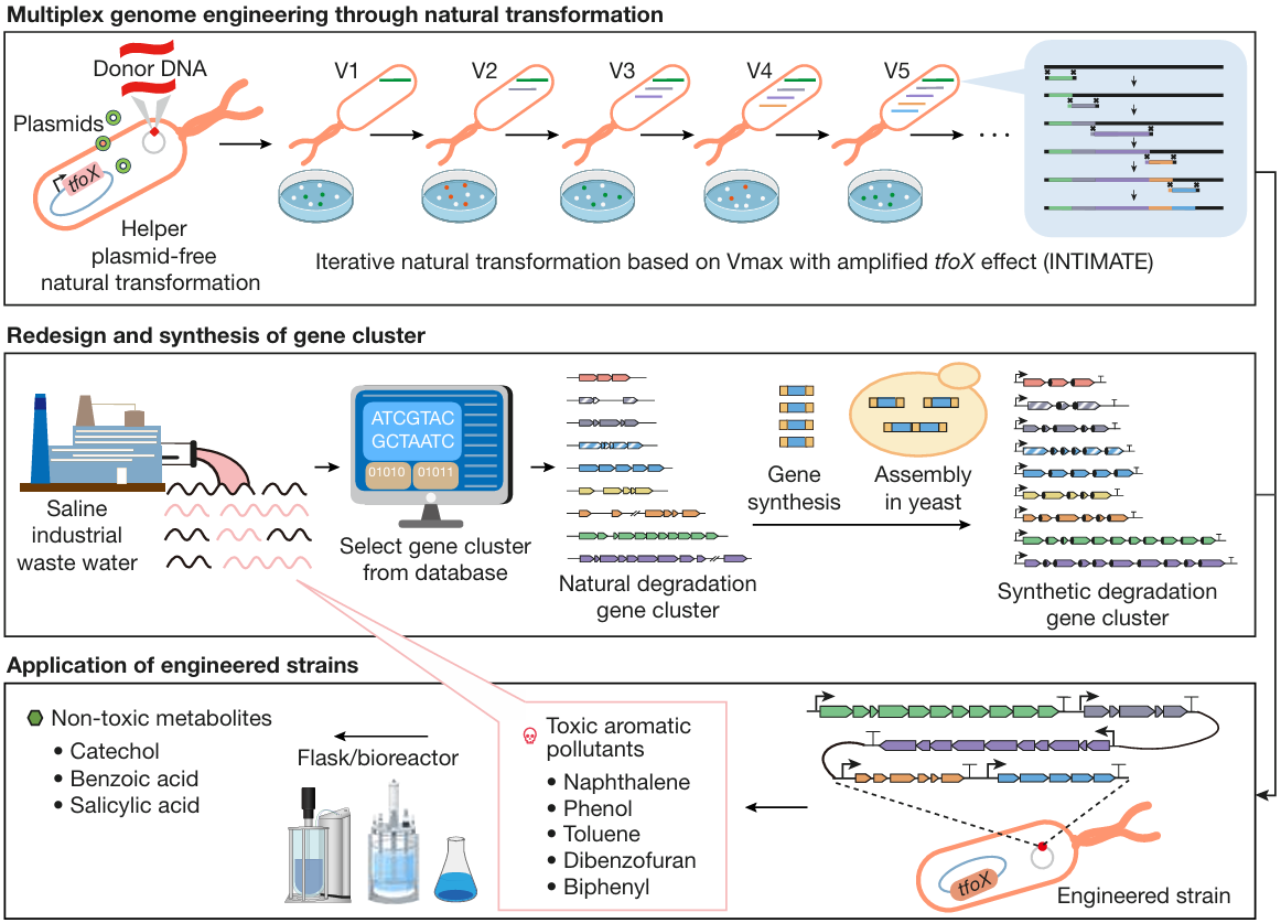This research successfully developed a technical platform for the construction of complex organic pollutant degradation bacterial strains, which realized the entire process from the designing and synthesizing of metabolic pathways to the construction, testing, and application of pollutant degrading strains in real-world scenarios. It provides a cheap and environmentally friendly solution for global challenges such as saline industrial wastewater emission, offshore oil spills, and microplastic pollution. At the same time, INTIMATE provides a universal technical platform to integrate multiple metabolic pathways within a single strain and expand the functions of engineered strains. It can be extended to the construction of other pollutant degradation bacterial systems, as well as other applications such as natural product synthesis and high-value chemical cell engineering construction.