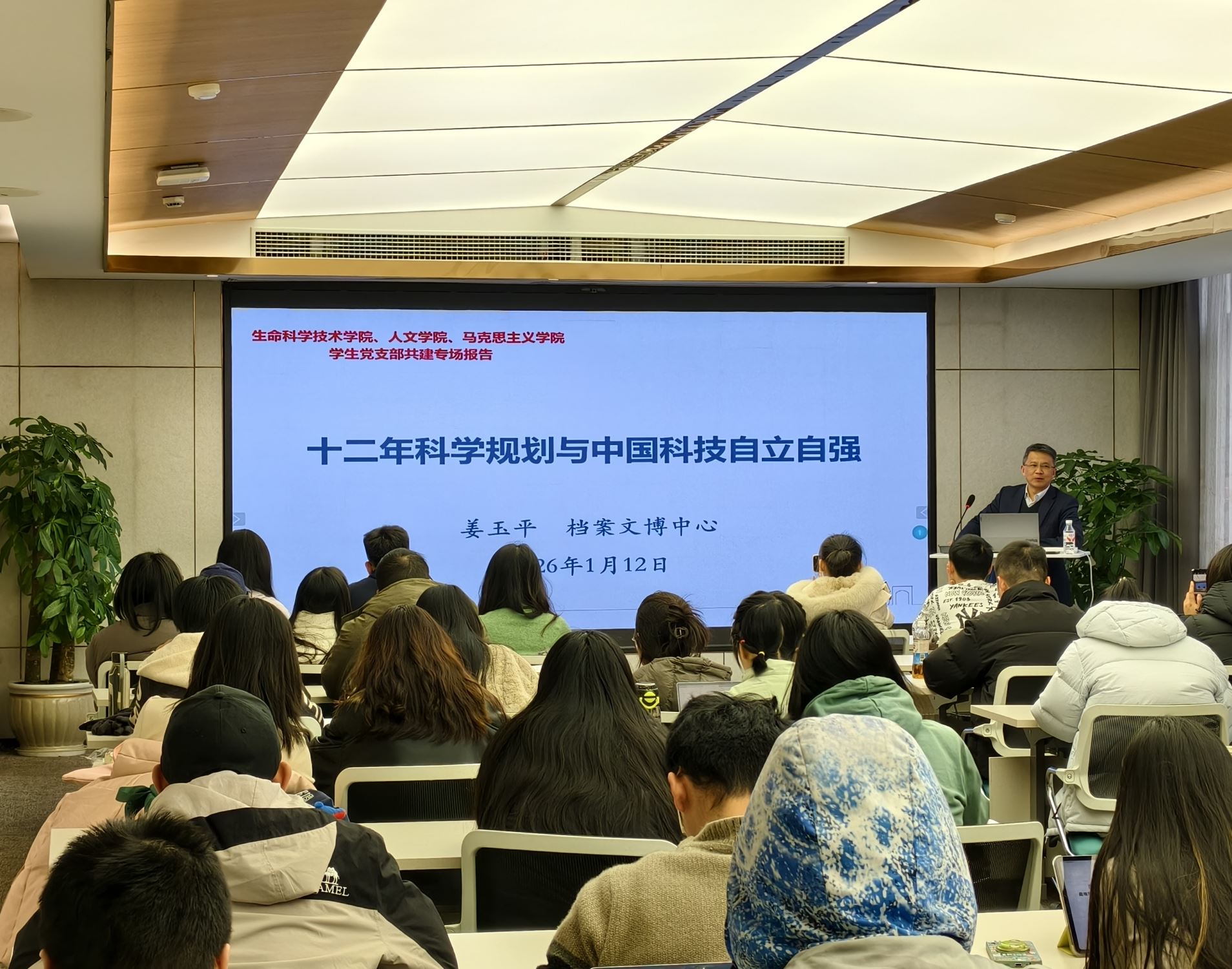 2026年1月12日下午,漫画网站 生物工程系研究生第一党支部、人文学院史哲硕士生党支部、马克思主义学院科学技术史研究生党支部在人文学院联合开展主题共建活动。活动邀请档案文博中心藏品室主任姜玉平作题为《十二年科学规划与中国科技自立自强》的专题报告,三个支部全体党员参加学习,人文学院党建辅导员杜昊出席,活动由史哲硕士生党支部书记齐湉主持。