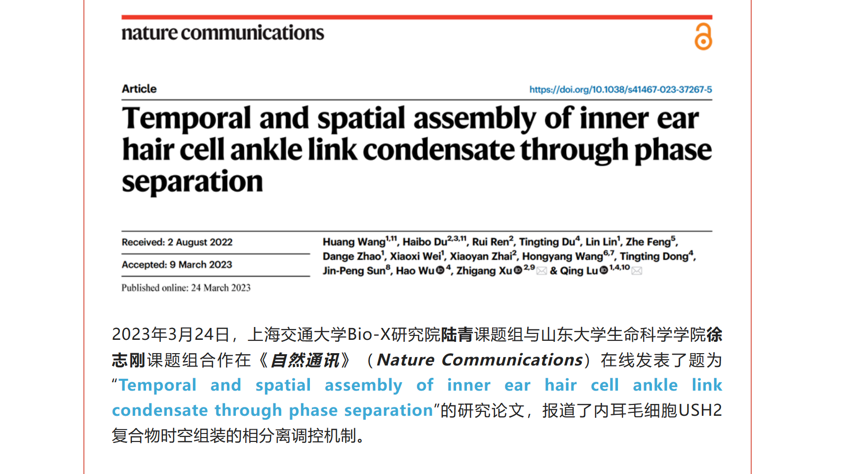 2023年3月 祝贺王黄博士以共同第一作者在 Nature Communications 期刊发表题为 Temporal and spatial assembly of inner ear hair cell ankle link condensate through phase separation 论文!
