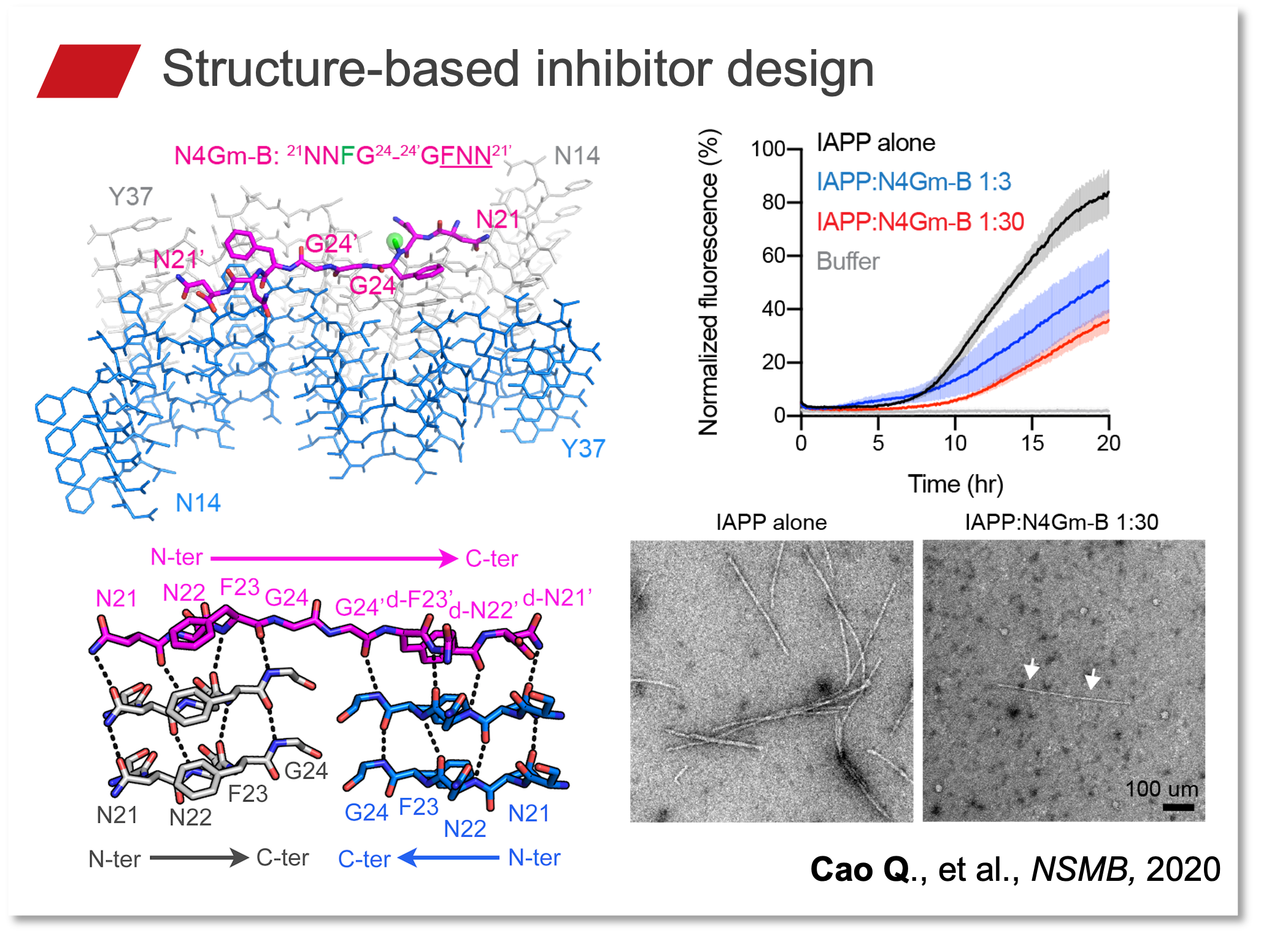 基于已解析的纤维结构,通过设计可结合于纤维表面的小分子,以达到抑制蛋白纤维化的目的。设计出的抑制剂将在体外和细胞层面进行验证,这些抑制剂的成功设计将有助于相关疾病的药物研发。