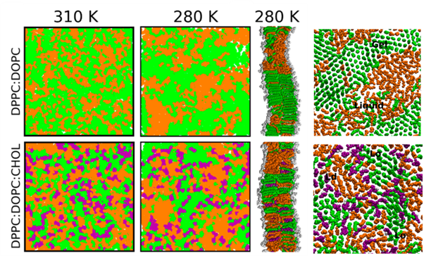 我们通过全原子尺度和粗粒度尺度的分子动力学模拟,研究生物膜的结构与功能(比如其相分离机制、纳米尺度微观结构的形成、膜性质对蛋白结构与功能的影响等),药物分子与生物膜的相互作用、脂质体完成药物递送的分子机制等;我们还开发一些适用于生物膜体系的多尺度模拟的力场与方法。