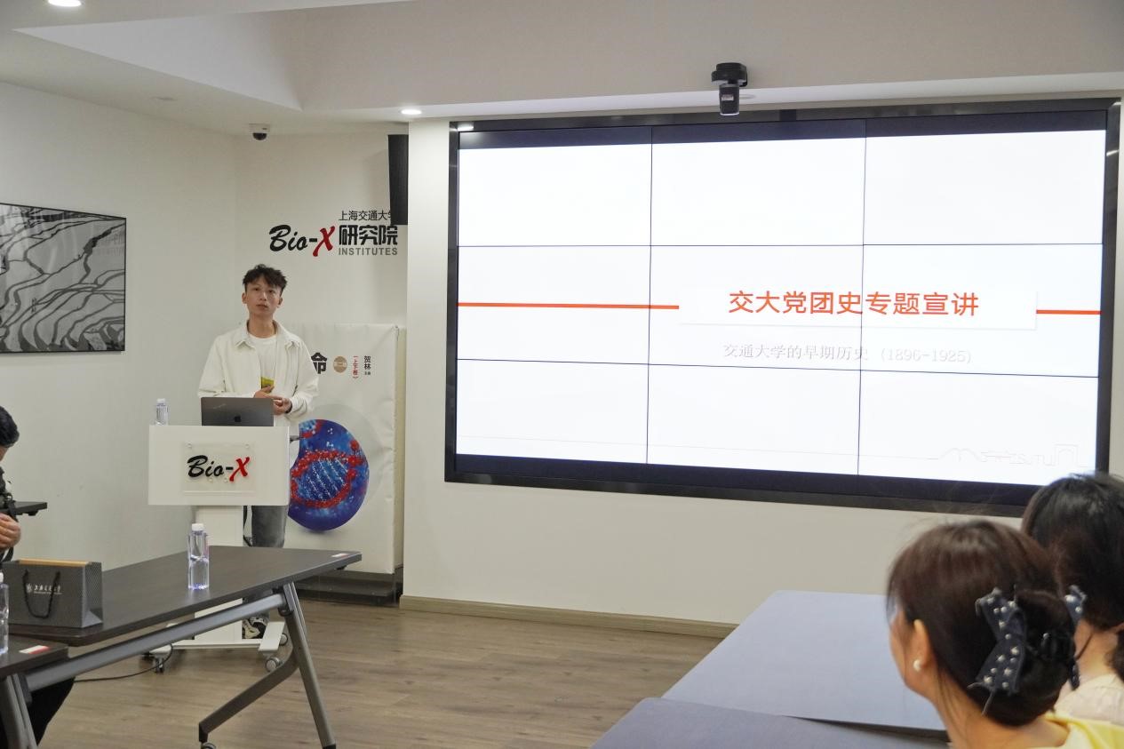 上午活动伊始,双方在徐汇校区Bio-X研究院会议室开展交流座谈,会议由Bio-X研究院研究生第二党支部副书记谭恺主持。Bio-X研究院研究生第二党支部的成员进行“交大党团史”专题宣讲,系统回顾了交通大学百余年来的党团发展历程,讲述了交大第一个党团组织的诞生与传承。随后,双方总结了二期共建以来的活动开展情况,肯定了过去在资源共享、主题活动联办等方面取得的成果,并就新一期共建计划展开讨论,提出了更聚焦交叉合作与青年成长的共建方向,为下一阶段的支部建设绘制蓝图。