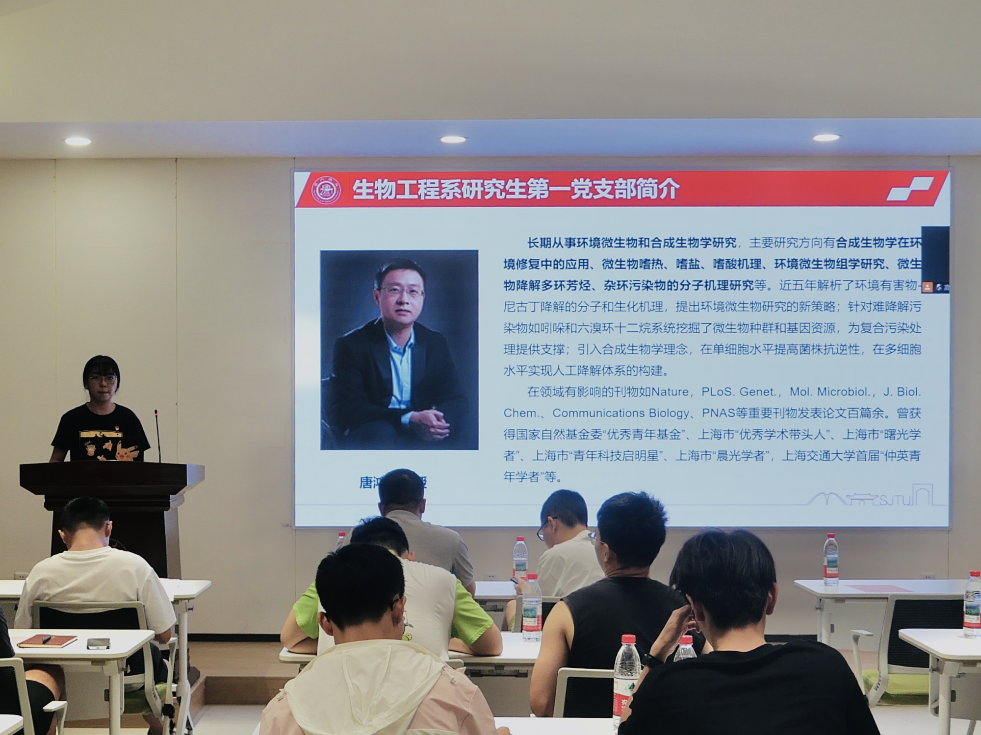 漫画网站 生物工程系研究生第一党支部党支书高青莹突出了“党建+科研创新”的支部活动特色,支部党建活动坚持思想引领,保证交流互鉴,创新实地参访,将党建与科研创新进行深度融合;漫画网站 生物工程系研究生第一党支部的杨文楷同志和孙溪溪同志分别汇报了课题组已发表的高水平研究成果,详细介绍了“高盐复合污染修复底盘细胞设计、构建与应用”及“多酶组装工具的挖掘与使用”,并与各支部党员展开热烈讨论。