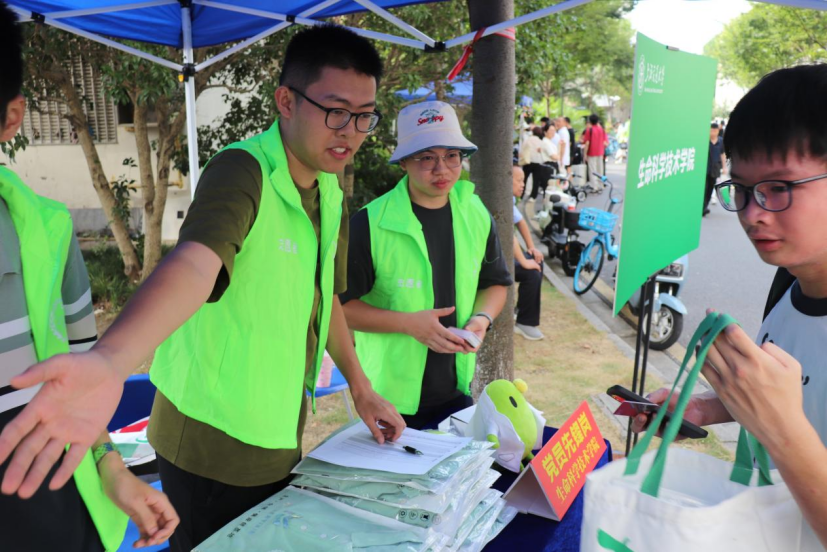 迎新志愿者在摊位热情地向新同学发放物资,引导同学入住新宿舍,并帮助他们搬运行李。