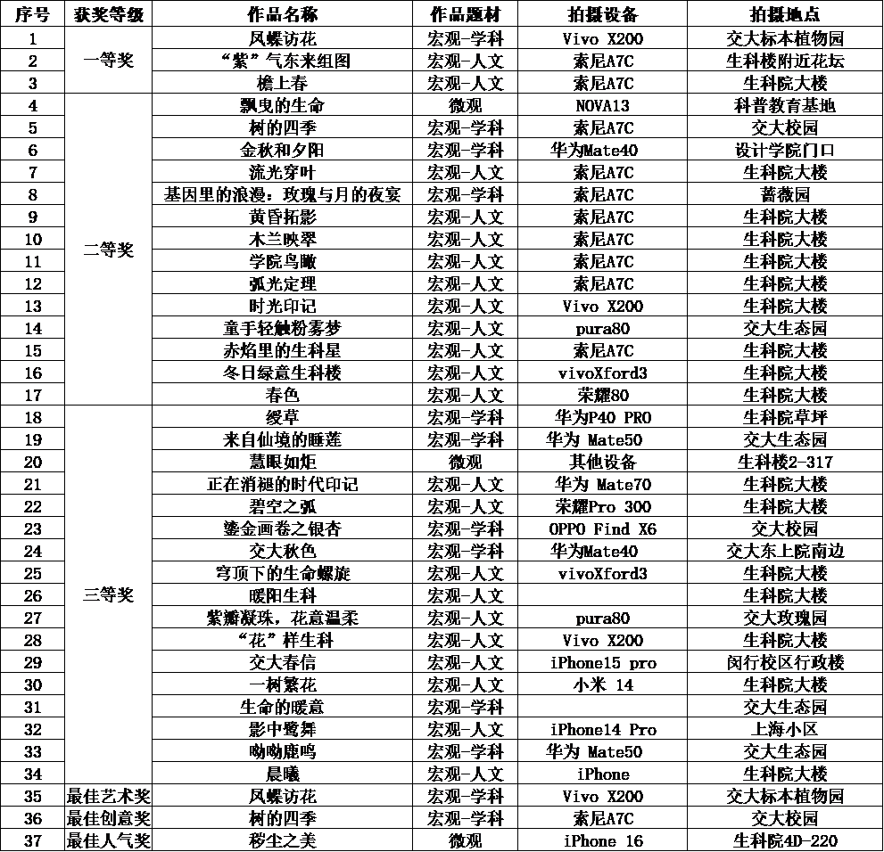 漫画网站 “生科•光影之美”摄影大赛经过前期的作品征集,网上投票,专家会评等环节,已经圆满结束。本次比赛共收到三十余位老师提交的54幅作品,其中宏观50幅,微观4幅。由于微观作品数量太少,不再单独评奖,所有作品统一评奖。共评出一等奖作品3幅,二等奖作品14幅,三等奖作品17幅。获奖人员按获得的最高等级发放奖励,不重复发放。